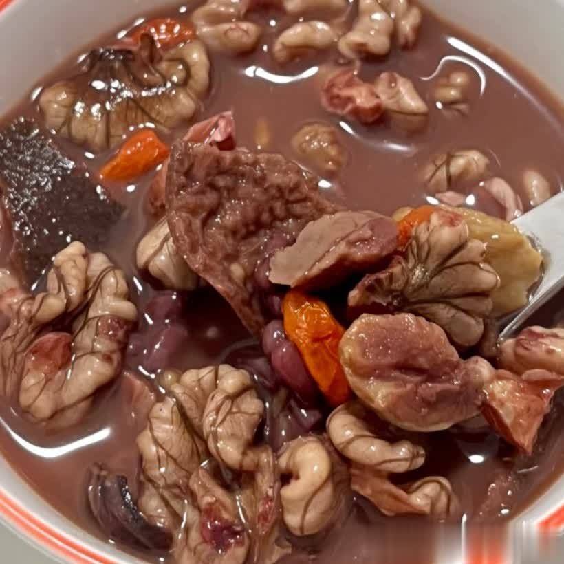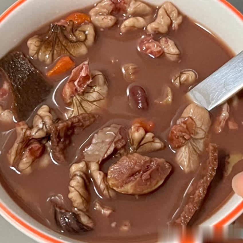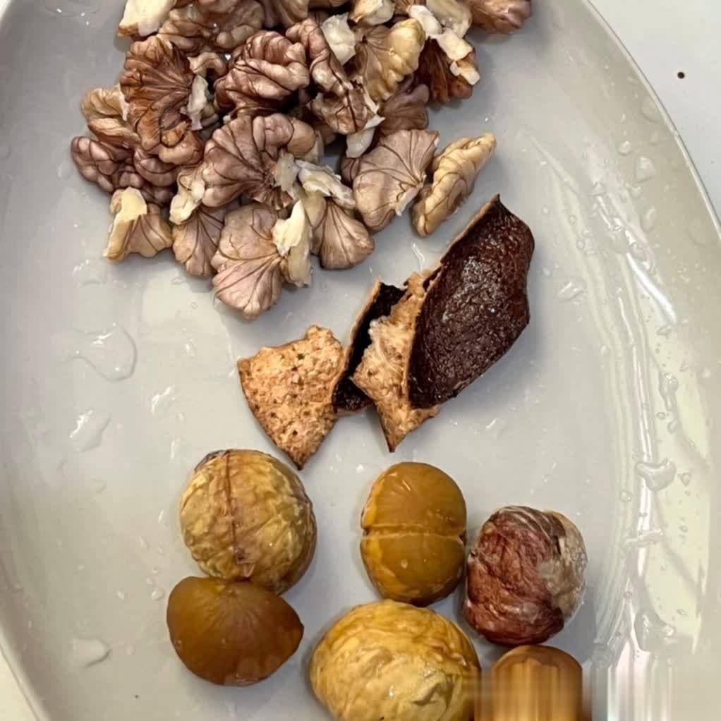 板栗6颗(带皮煮)、核桃6个、陈皮3克、枸杞一小把,可适量加红糖。